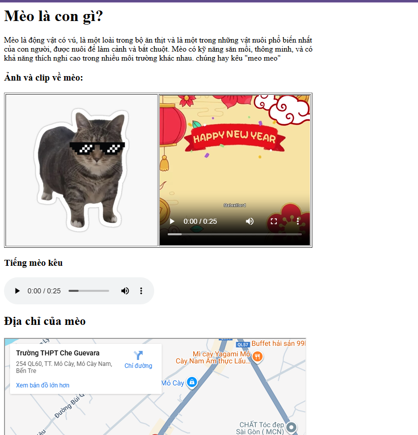Yêu cầu: hãy tạo 1 trang web như sau, kích thước của các tài nguyên hãy điều chỉnh cho phù hợp (hãy sử dụng controls cho video và audio để không bị lỗi). Font mặc định, tiêu đề chính h1 hoặc h2, tiêu đề phụ h3 hoặc h4, cuối trang có địa chỉ từ iframe ggmap